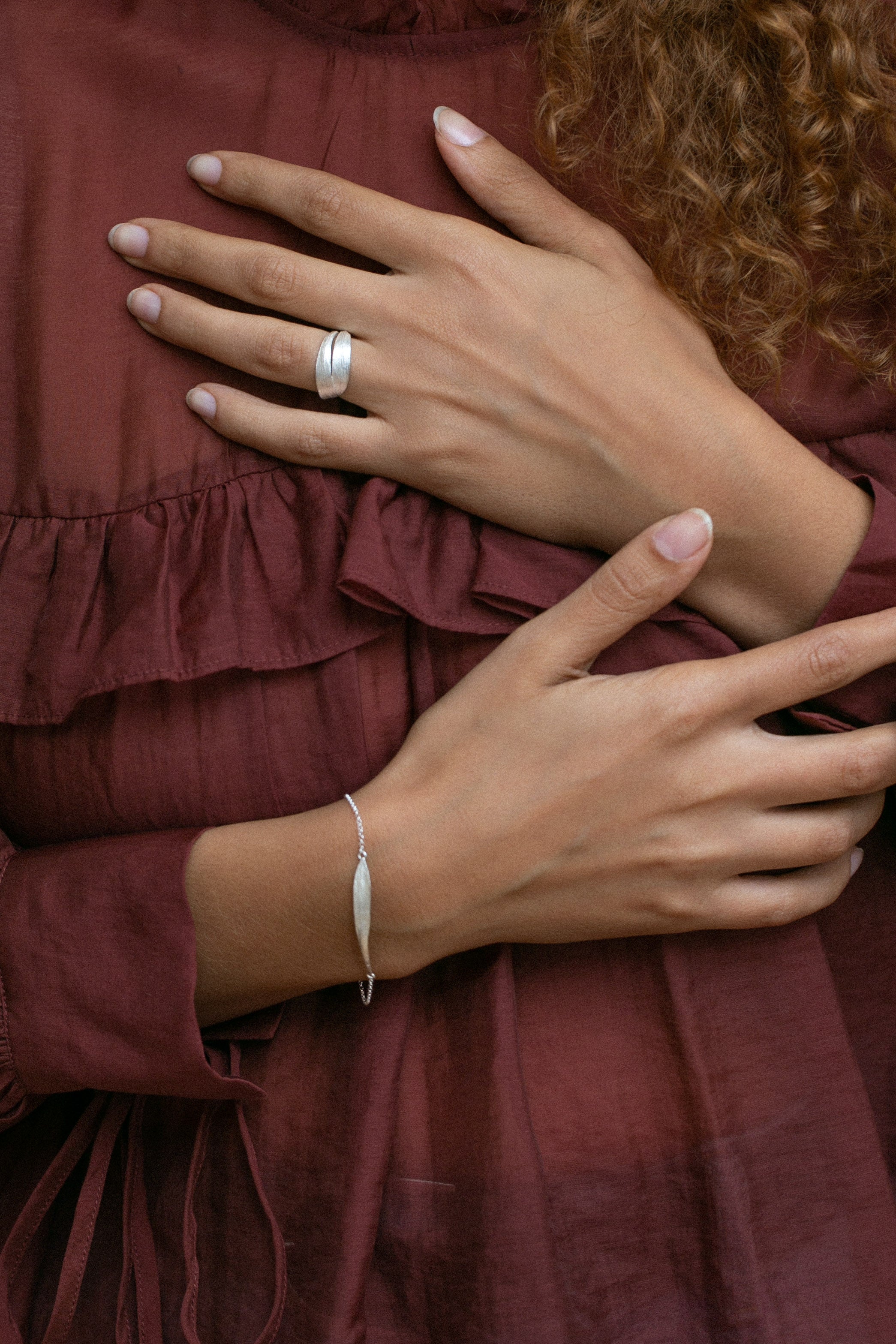 A subtle, organic form. Light and comfortable to wear, with a quiet strength in its structure. Designed and created by Małgosia and Anastazja in a traditional goldsmith workshop in Germany.