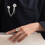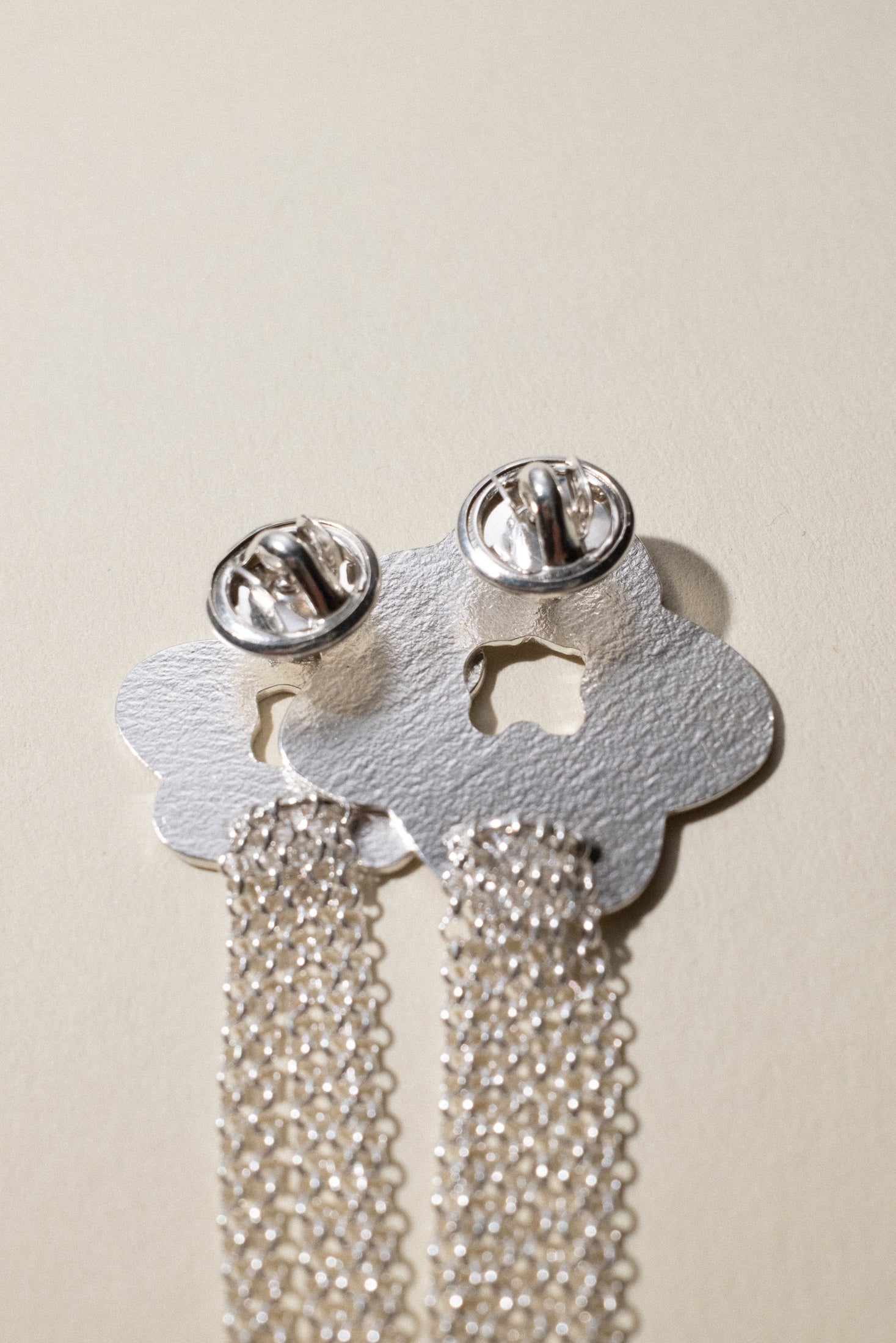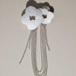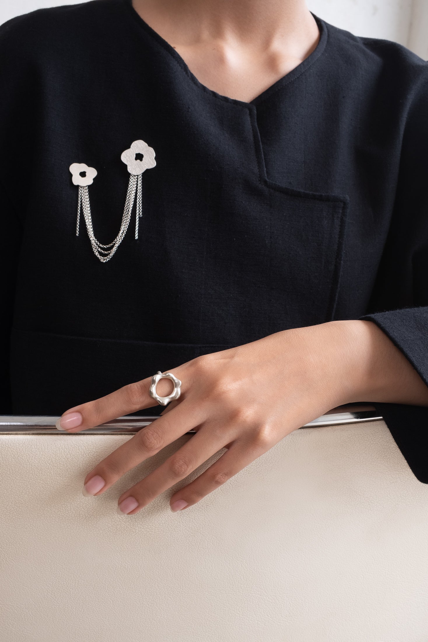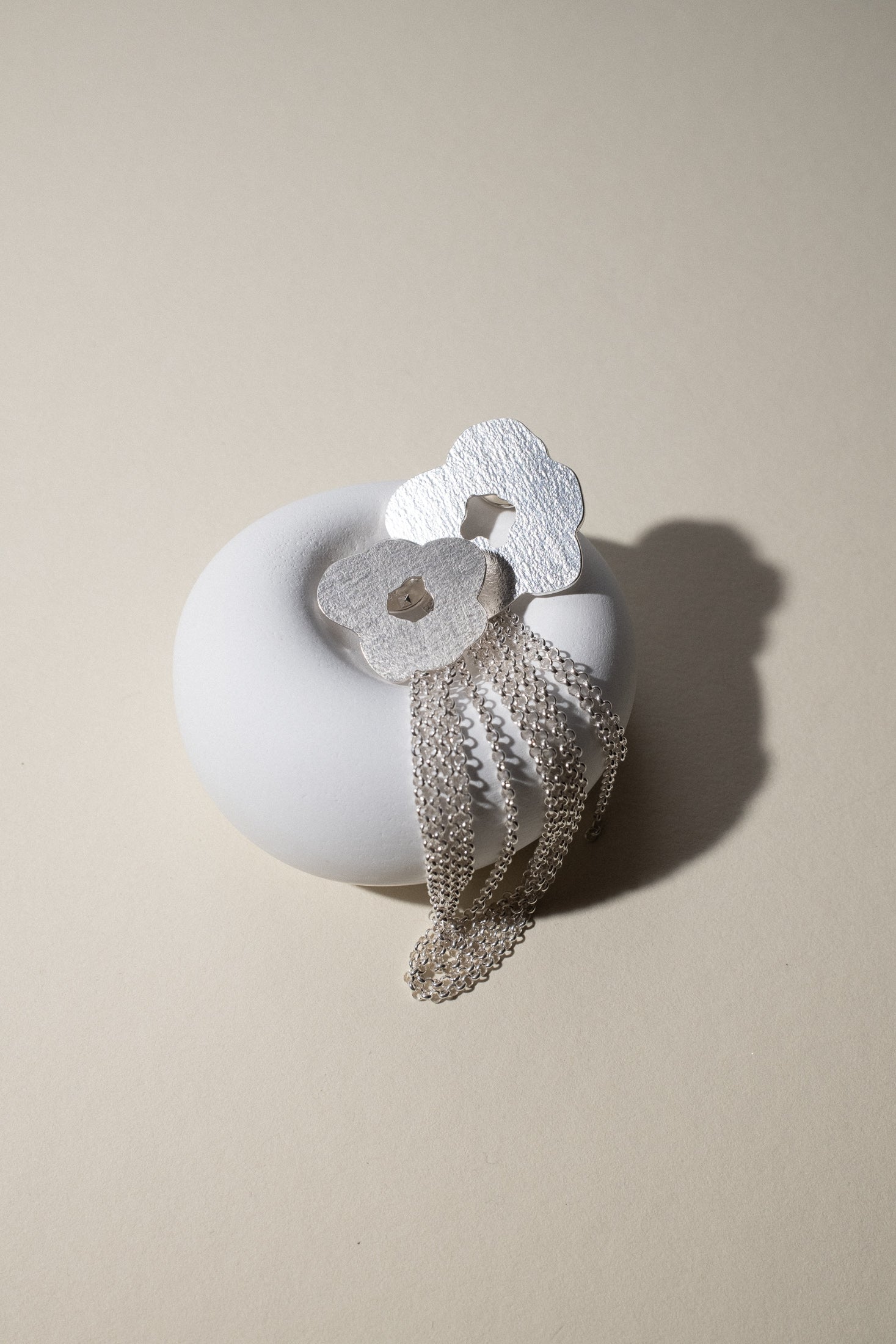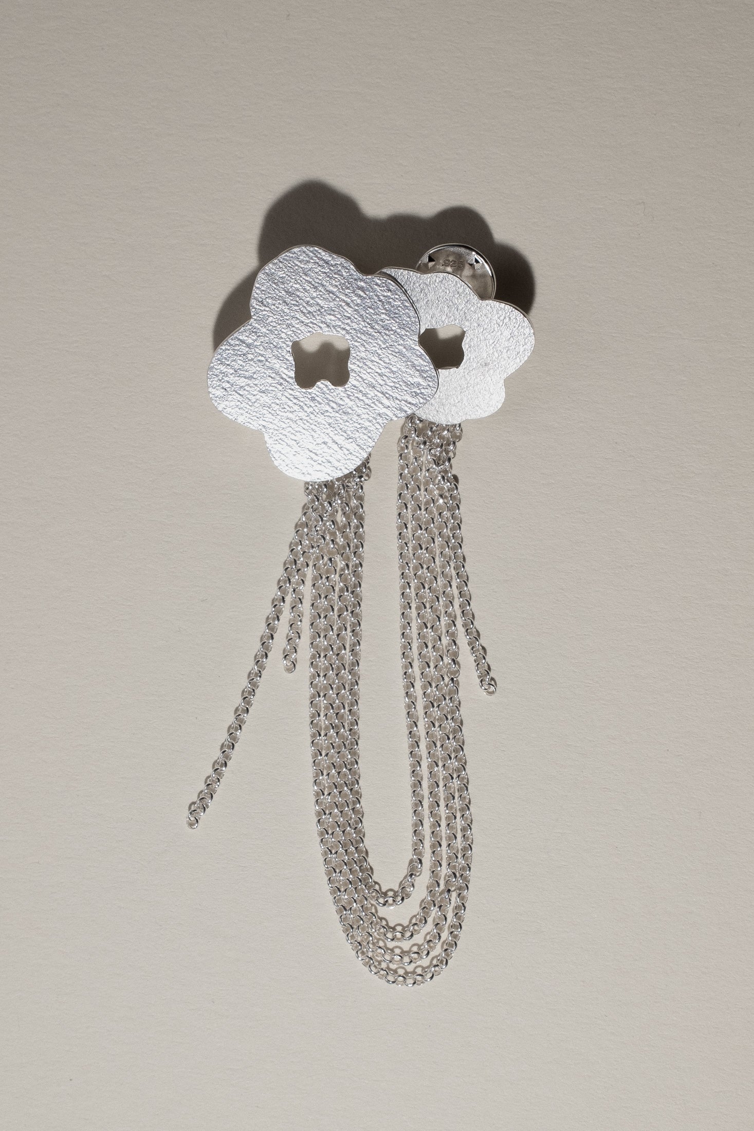 Zwei organische Formen, verbunden durch feine Ketten. Entworfen, um an Kleidung befestigt zu werden, bewegt es sich subtil mit Ihnen und schafft eine weiche, skulpturale Präsenz. Entworfen und hergestellt von Małgosia und Anastazja in einer traditionellen Goldschmiedewerkstatt in Deutschland.