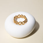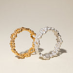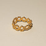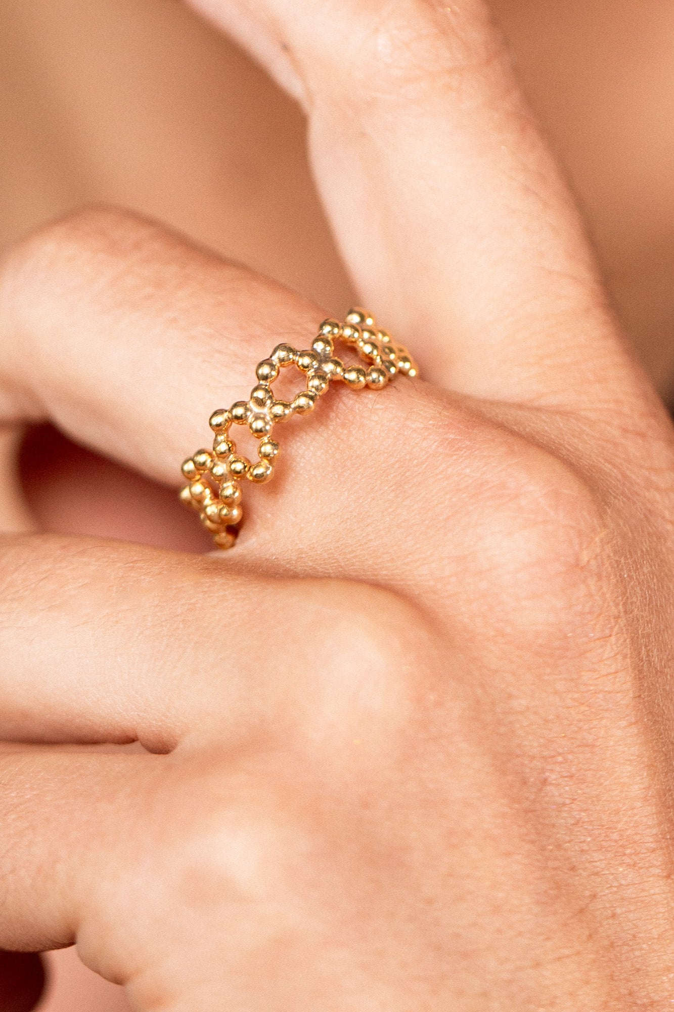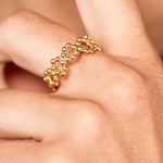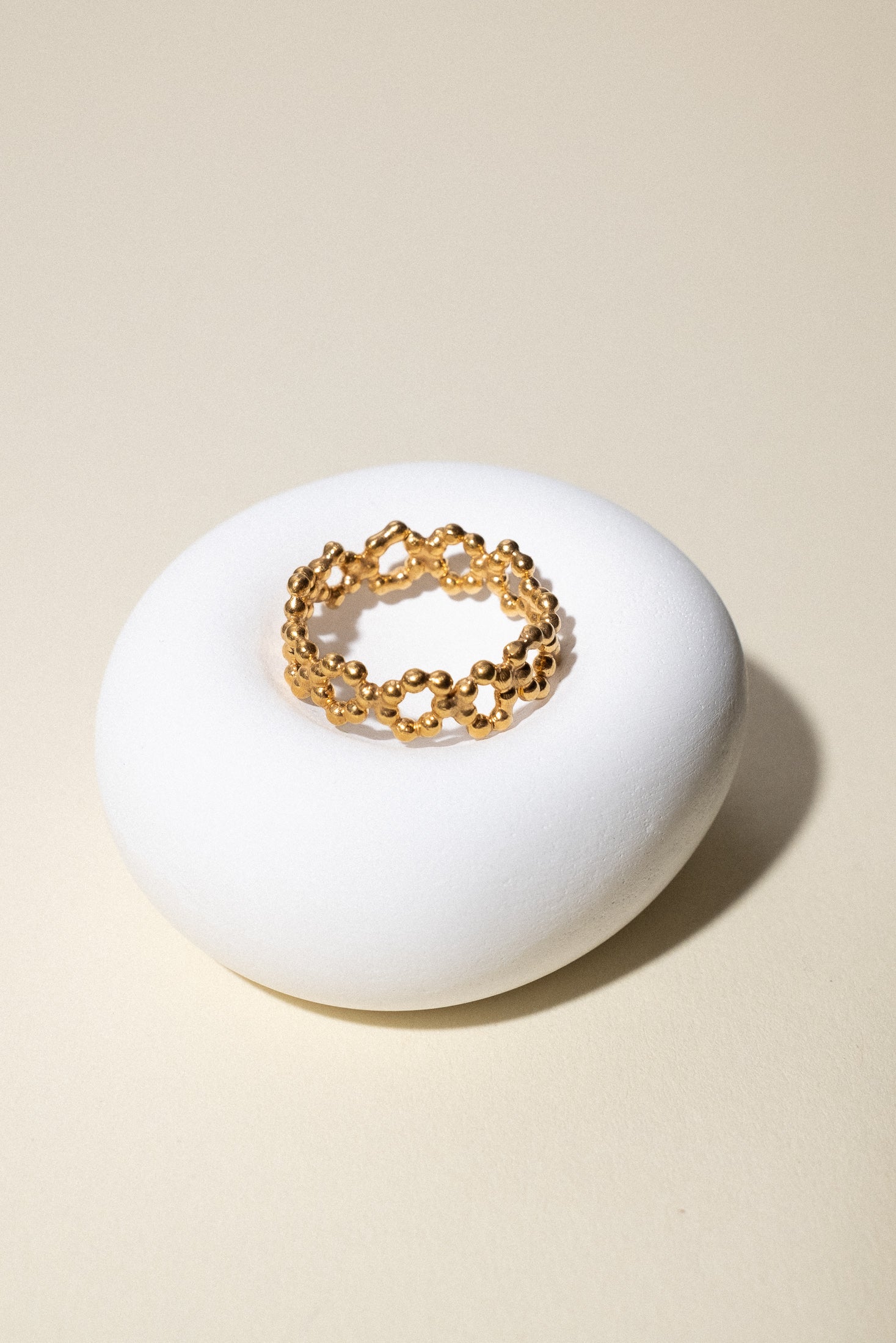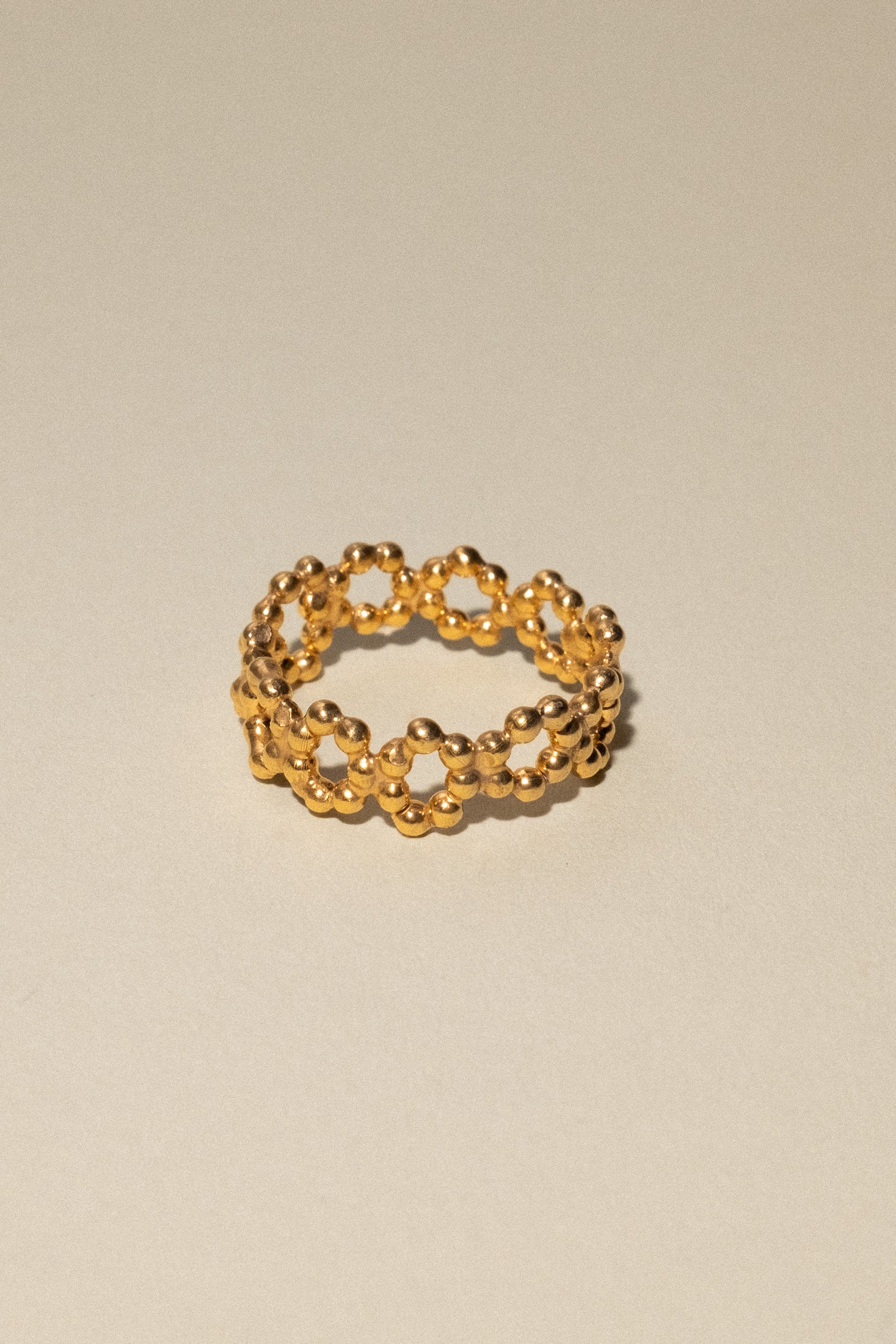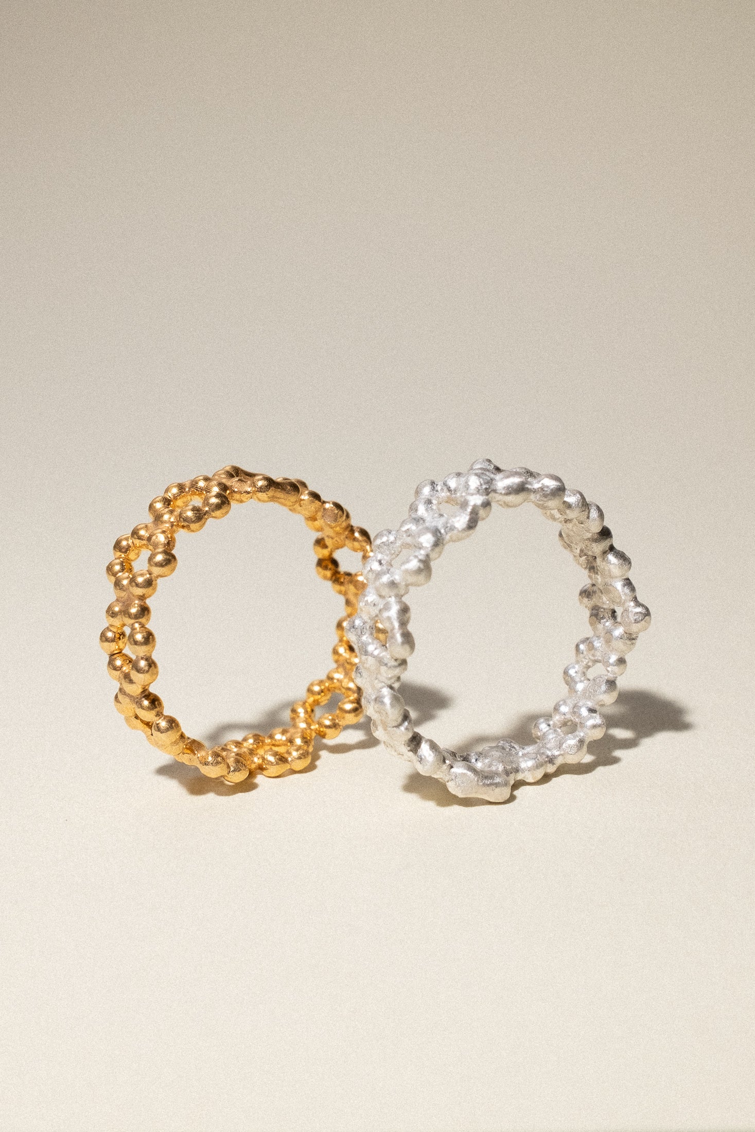 Eine zarte, offene Struktur aus kleinen, miteinander verbundenen Elementen. Inspiriert von der Idee von Ursprung und Kontinuität erinnert die Oberfläche an die Leichtigkeit handgewebter Spitze. Angenehm zu tragen, schmiegt sie sich mit einer weichen, strukturierten Form um den Finger. Entworfen und gefertigt von Małgosia und Anastazja in einer traditionellen Goldschmiedewerkstatt in Deutschland.