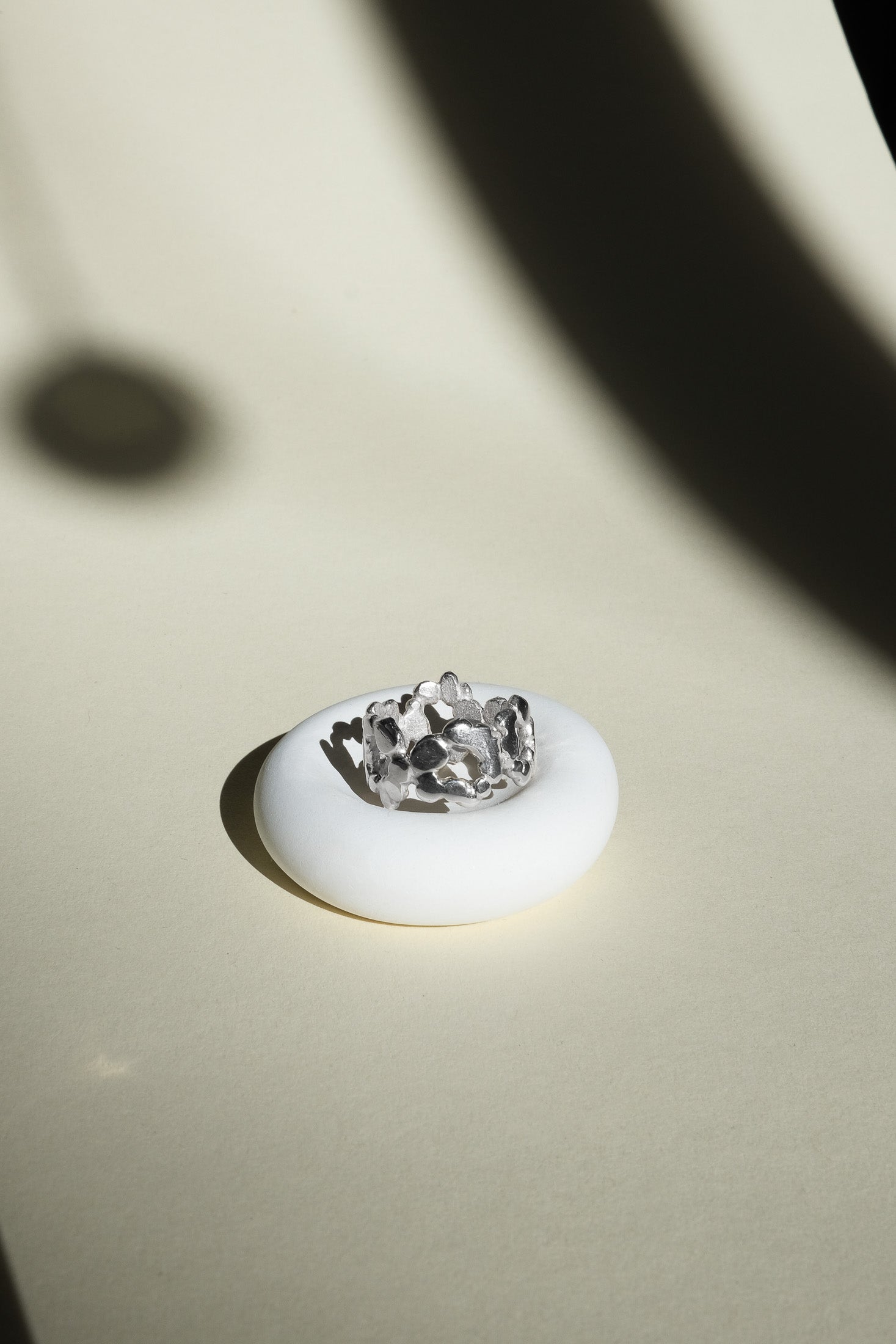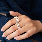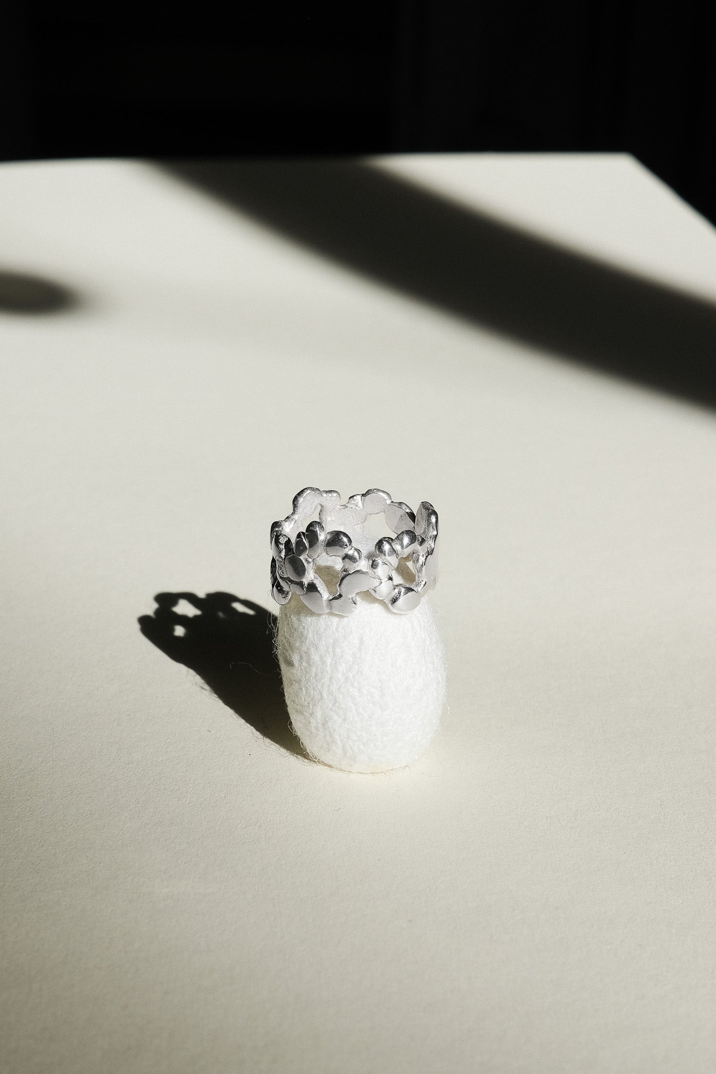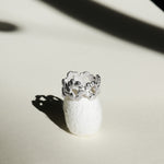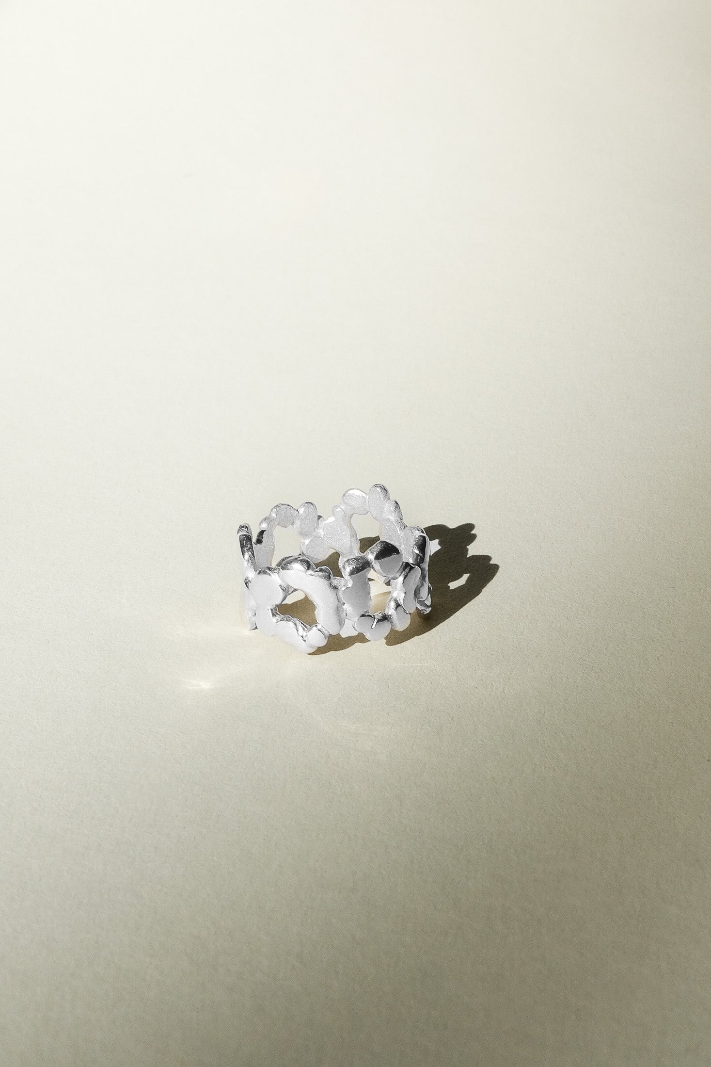 Eine dichte, organische Komposition aus verbundenen Elementen. Angenehm zu tragen, schmiegt sich ihre Form als strukturierte, durchgehende Spange um den Finger. Entworfen und gefertigt von Małgosia und Anastazja in einer traditionellen Goldschmiedewerkstatt in Deutschland.